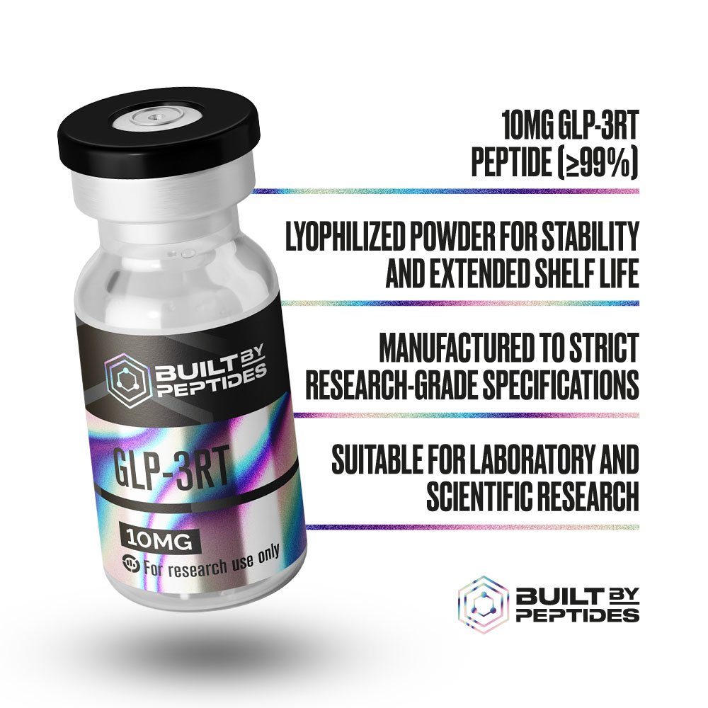 Introducing GLP3-RT, an investigational triple-agonist peptide exclusively from Built By Peptides. Designed for advanced laboratory exploration, this variable product features two precision-dose variants (10mg and 20mg), supplied as lyophilized powder in single 3ml vials. The clean, clinical layout ensures ease of use for researchers focusing on metabolic pathways without disrupting your research workflow.